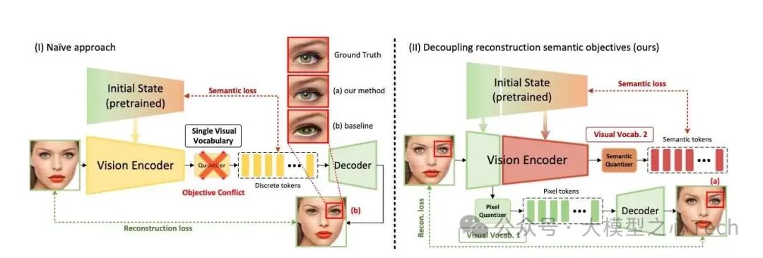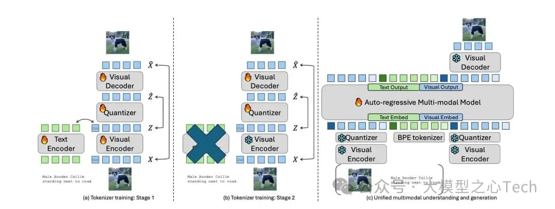 训练一个适合于理解和生成任务的Visual Tokenizer,这样做的目的是大家发现视觉生成和理解所以来的视觉特征的特点是不一样的,视觉生成更依赖于偏高频、low-level的视觉特征,比如VAE-Based的特征,而视觉理解更偏向于偏高层语义的特征,比如CLIP、SigLIP等,不过一些早期的方法似乎不管这些,CLIP的视觉Encoder直接作为视觉生成的表征提取模型,不过后面就不是主流了。所以目前这方面的研究要么是 视觉生成和视觉理解特征分开提取 (比如DeepSeek的Janus、Janus-Pro),要么是训练一个 两种任务都适配的Visual Tokenizer ,比如字节跳动的Token-Flow、Muse-VL,港大的UniTok等,当然这一块也包含有 两个Visual Encoder 和 单个Visual Encoder 的。