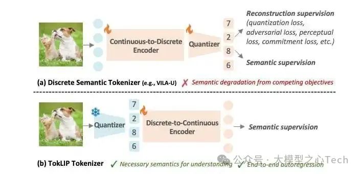 腾讯提出的TokLIP也是Single-Encoder的形式,VQGAN Encoder提取视觉特征之后,经过离散量化的特征经过一个Causal Token Encoder得到Semantic Feature,之后计算图片Semantic Feature的蒸馏Loss以及和文本特征的对比学习Loss。