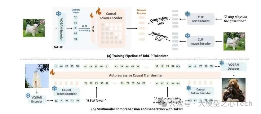 TokLIP Tokenizer包括VQGAN的encoder 、MLP和Causal Token Encoder ,输入图片为 ,得到的特征为 ,