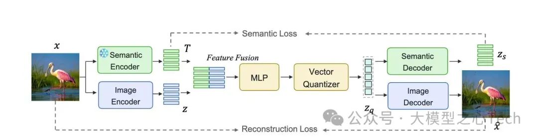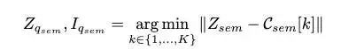输入图片 经过语义编码器 (CLIP、SigLIP的Image Encoder)之后得到语义特征 ,量化bottleneck 将 量化到离散的特征空间 ,量化的公式化表达如下,
