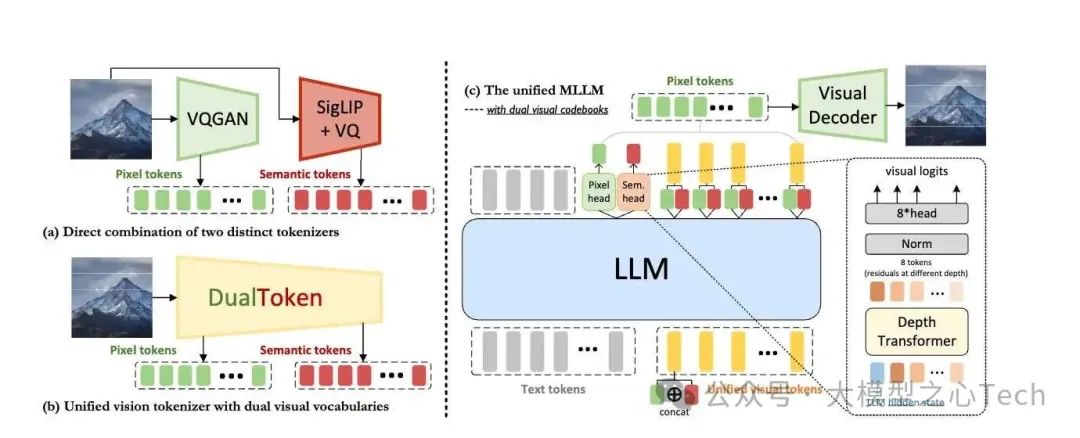 百川、西湖大学、浙江大学、上海AI Lab、上海创新中心和武汉大学提出的DualToken也是只用一个Visual Encoder提取适合于理解和生成任务的视觉特征,DualToken和TokenFlow、Muse-VL类的方法不一样,没有引入Vision Encoder和Semantic Encoder,而是使用了单一的Vision Encoder,其中底层的视觉特征用于图片重建,深层的视觉特征用于semantic对齐;相同的是针对语义特征和图片重建特征分别用了不同的Visual Codebook。