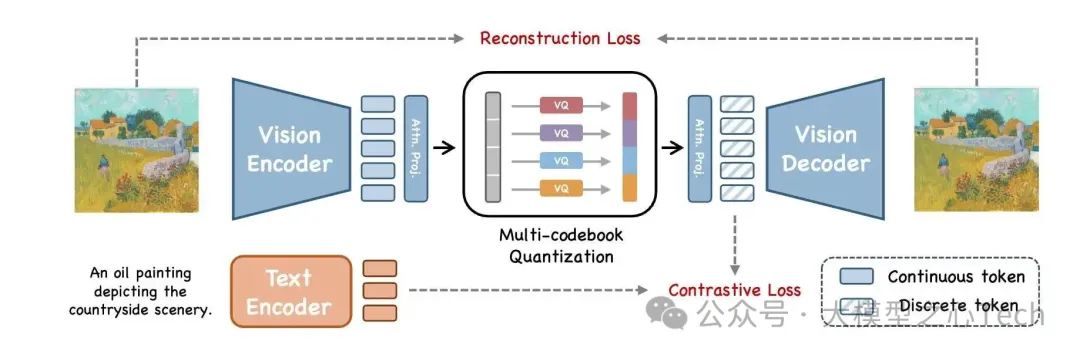 港大、华科和字节的工作UniTok和QLIP其实做法有点儿类似,也是只有一个视觉Encoder,而且同时用作视觉生成和理解的特征提取器,只不过在训练的时候,用到了多个codebook的量化,而且和文本特征的对齐也是放在经过离散量化的视觉特征这儿,而不是Vision Encoder输出的特征。