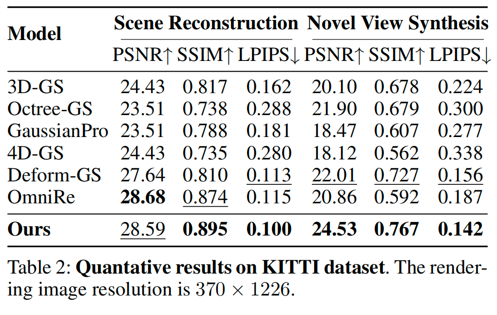 KITTI上的结果。 DriveSplat的性能也在KITTI数据集上进行了评估。如表2所示,DriveSplat在重建和新视角合成任务中均优于基线方法。图5展示了渲染结果,其中DriveSplat表现出更优的背景清晰度和对动态车辆的精确渲染。与OmniRe相比,我们的方法在新视角合成方面表现出更好的性能,尤其是在保留背景细节方面,如图5第二行所示。