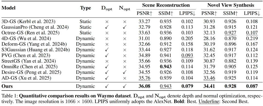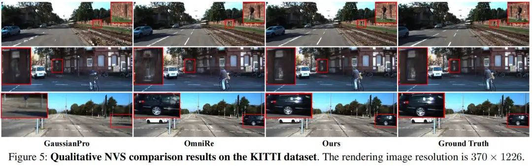 研究了深度和法线先验在提升渲染质量和几何准确性方面的作用。我们的方法在Waymo和KITTI数据集上的NVS任务中均达到了最先进的性能。