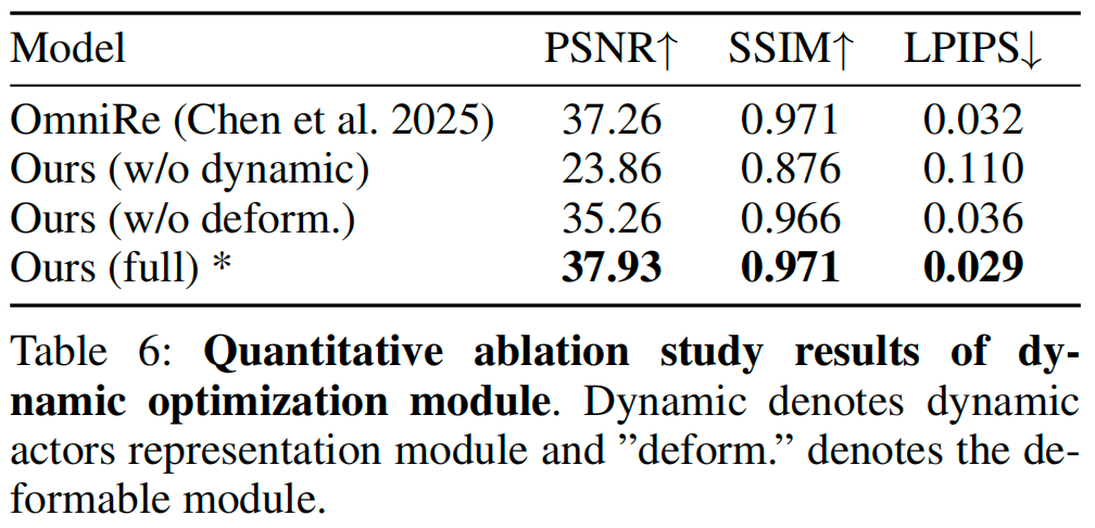 动态优化模块的消融研究。 我们还额外选择了两个Waymo序列,这些序列在前视图中包含大量行人,以评估我们的非刚性参与者重建性能。将场景中的动态和静态元素解耦能有效提升移动参与者渲染的质量。添加个体动态物体表示可以改善移动车辆的渲染质量,但对于非刚性参与者,仍然存在运动模糊问题。在添加可变形模块后,非刚性参与者的渲染质量得到了显著提升。与额外结合了SMPL的OmniRe相比,我们的方法达到了相当的重建性能(表6)。