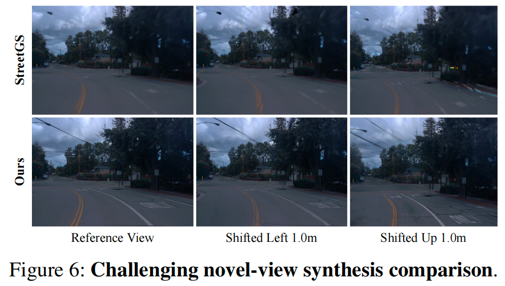 Waymo上的结果。 我们在Waymo数据集上(表1)将我们的方法与现有方法进行了评估,这些方法包括静态方法和动态方法,并使用了重建和新视角合成两种指标。我们的方法在PSNR和LPIPS重建指标上均超越了所有基线,展示了高精度。尽管StreetGS和 OmniRe在重建指标上表现良好,但它们在新视角合成方面表现不佳,凸显了它们在处理视角转换时的局限性。相比之下,DriveSplat在新视角合成任务中表现出色,在所有三个评估指标上均优于所有基线。视觉分析(图4)突显了DriveSplat在车辆渲染中无伪影的优势、对具有挑战性的静态背景细节的增强清晰度,以及对动态车辆的精确描绘。我们进一步展示了在更具挑战性的设置下的新视角合成对比结果,其中自车(ego-car)轨迹向左平移1.0米,向上平移1.0米,如图6所示。