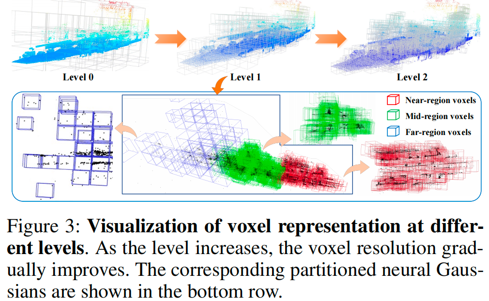 静态背景表示。 随后,我们使用八叉树结构初始化背景表示模型,并为驾驶场景引入一种优化方法。遵循Octree-GS ,我们根据预测的深度范围( , )计算八叉树层数 。八叉树结构在多个细节层次(LOD)上构建,所有被占据的体素中心 通过在不同层级上对点云 进行量化得到。基础体素大小 通过将初始体素大小 除以2的幂次来计算,即 ,其中 。随着层级增加,基础体素大小逐渐减小,如图3所示。锚点 被选为体素中心,确保 。