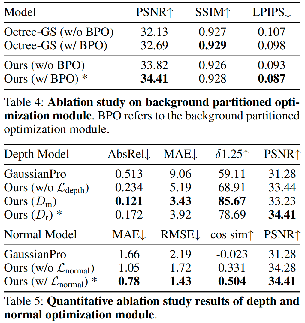 尽管已经验证了点云初始化,我们还对分区背景优化模块进行了消融研究。我们将我们的方法在有和没有背景优化模块的情况下的性能进行了比较,如表4所示。结果表明,BPO模块可以提升方法的性能,这对于Octree-GS也同样适用。