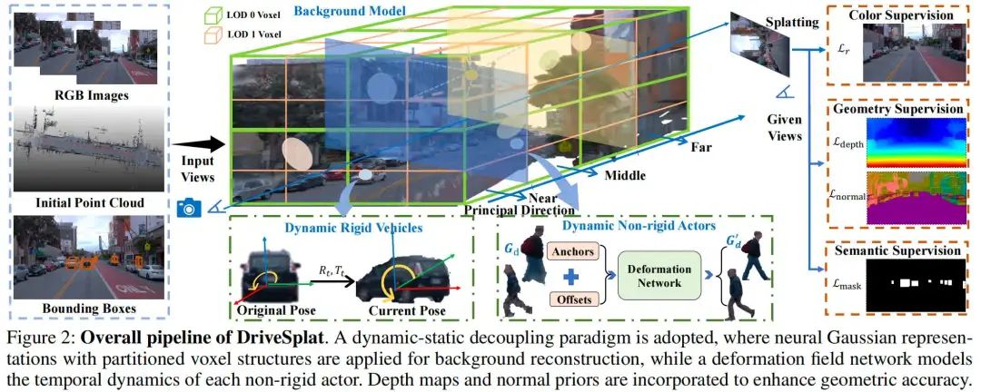 为了解决这些相互强化的挑战,我们提出了DriveSplat,这是一种基于神经高斯表示并具有动静解耦的视角鲁棒重建框架。以由SFM和LiDAR融合的点云为anchor,我们将动态点云从静态背景中分离出来,并用它们分别初始化前景参与者和背景表示。然后在这些空间锚点上构建一个基于八叉树的分区体素结构,其多级体素表示对应于不同的细节层次(LOD)。驾驶场景通常在近程和中程表现出更密集的点分布。为了更好地捕捉这些区域的细粒度细节,我们估计场景的主轴,并使用聚类算法将其分割为近、中、远三个区域。近区和中区的体素尺寸被细化,以更好地适应密集的点分布。对于场景中的动态参与者,我们使用边界框信息将每个重建的实例从局部坐标系转换到全局坐标系。对于行人和骑行者等非刚性动态参与者,我们额外设计了一个形变网络,通过随时间调整其属性(例如,位置、旋转、尺度)来建模神经高斯的时间演化。为了进一步提高几何质量,我们使用预训练单目模型预测的稠密深度图和表面法线图对重建过程进行监督,确保渲染中的几何一致性。总之,我们的主要贡献总结如下: