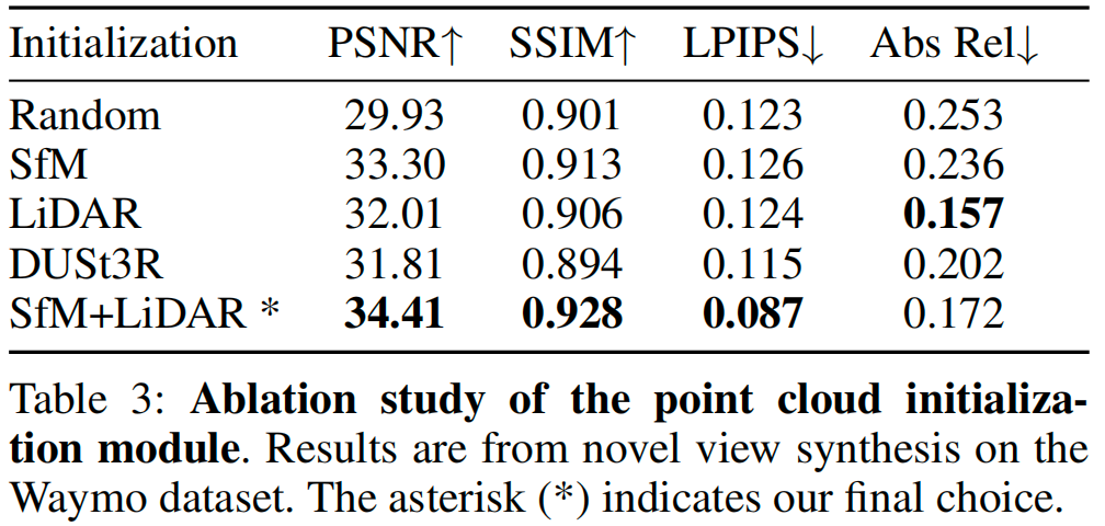 初始化模块的消融研究。 我们评估了不同初始化方法的影响,如表3所示。LiDAR提供了最精确的点云,但对高层建筑和远处区域的覆盖不足。尽管SfM提供的点更稀疏,但它提供了更广泛的场景覆盖,因此略优于单独使用LiDAR。DUSt3R产生了最密集的点云,但由于与真实世界坐标在尺度和位置上的错位,即使经过变换,其性能也未达到最优。因此,我们选择了SfM+LiDAR组合进行初始化,这产生了最佳的渲染结果。