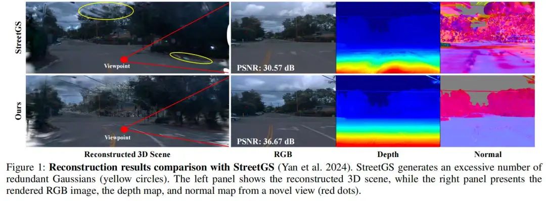 针对上述关键差距,我们的工作旨在为动态自动驾驶场景提供一个视角鲁棒且几何精确的重建框架。与通过监督稳步提升渲染效果的训练视角不同,新视角增加了变异性,对一致的场景重建提出了挑战。3D-GS系列模型通过增量添加高斯椭球体来提升在训练视角下的渲染性能;然而,这可能导致冗余的高斯椭球体,当从其他视角观察时,会产生模糊和噪声。以往针对驾驶场景的重建方法依赖于激光雷达(LiDAR)进行深度监督,但LiDAR无法提供像素级的深度真值(ground truth),尤其是在高层建筑和远处物体上缺乏有效的监督。此外,这些方法未能充分解决重建模型中表面质量的优化问题,导致法线图结果不佳,如图1所示。