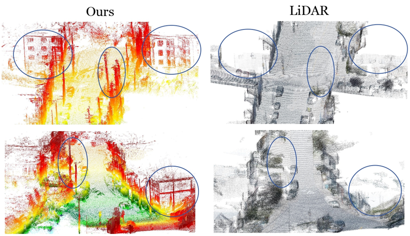 (1) 更广的覆盖范围:纯视觉几何重建可以弥补激光雷达在空间覆盖范围上的局限性,尤其是在大范围区域。在某些特定情况下,其性能甚至能超越激光雷达,例如在重建高层建筑时。