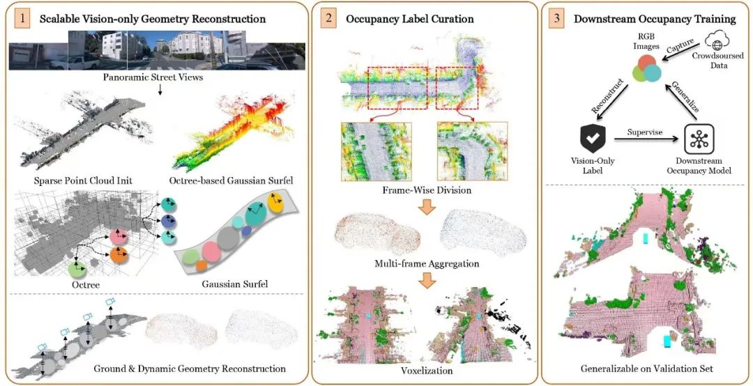 相比之下,GS-Occ3D 引入了一个低成本、可规模化的占据栅格标注新范式,该框架能有效利用来自消费级车辆的大量众包数据进行自动标注。