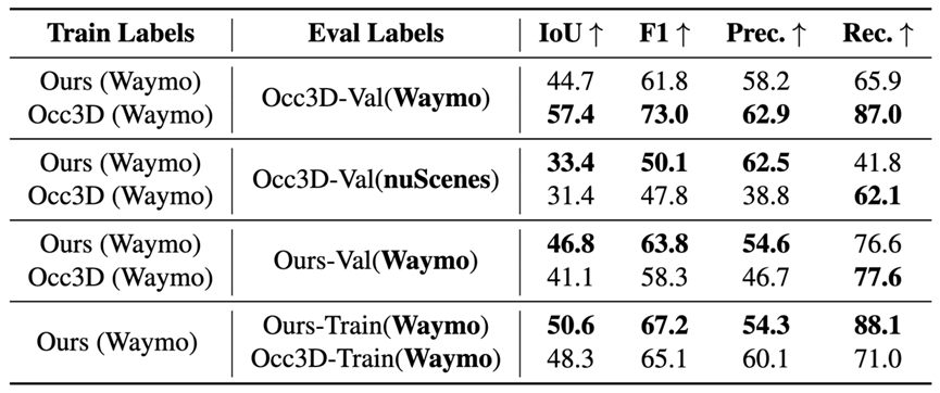我们首次使用纯视觉方法重建了整个 Waymo 数据集。我们在 Occ3D-Waymo 数据集上验证了标签对于下游感知模型的有效性,并在 Occ3D-nuScenes 数据集上展示了更优的零样本泛化能力。这证明了我们的方法在面向大规模自动驾驶应用时,具备高度的可扩展性与可靠性。