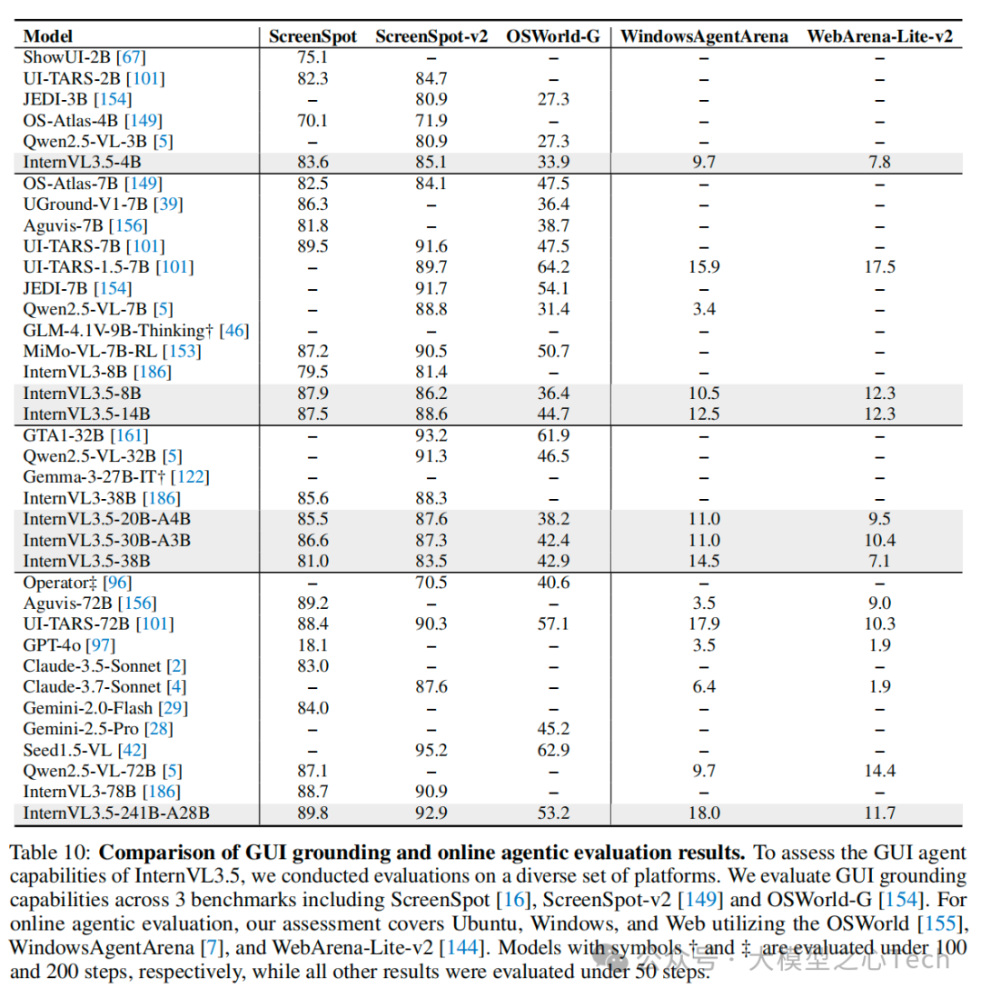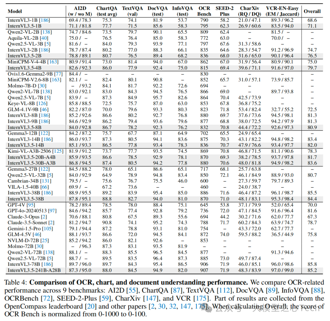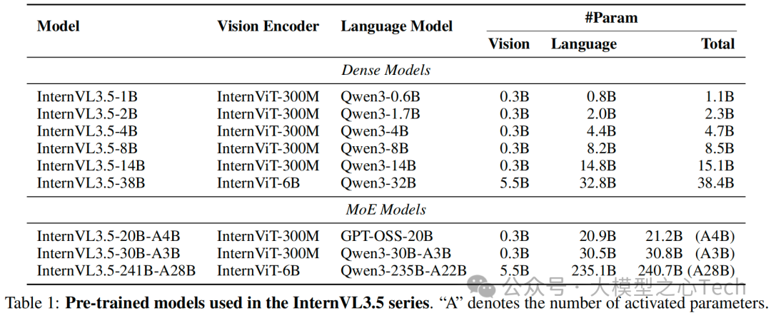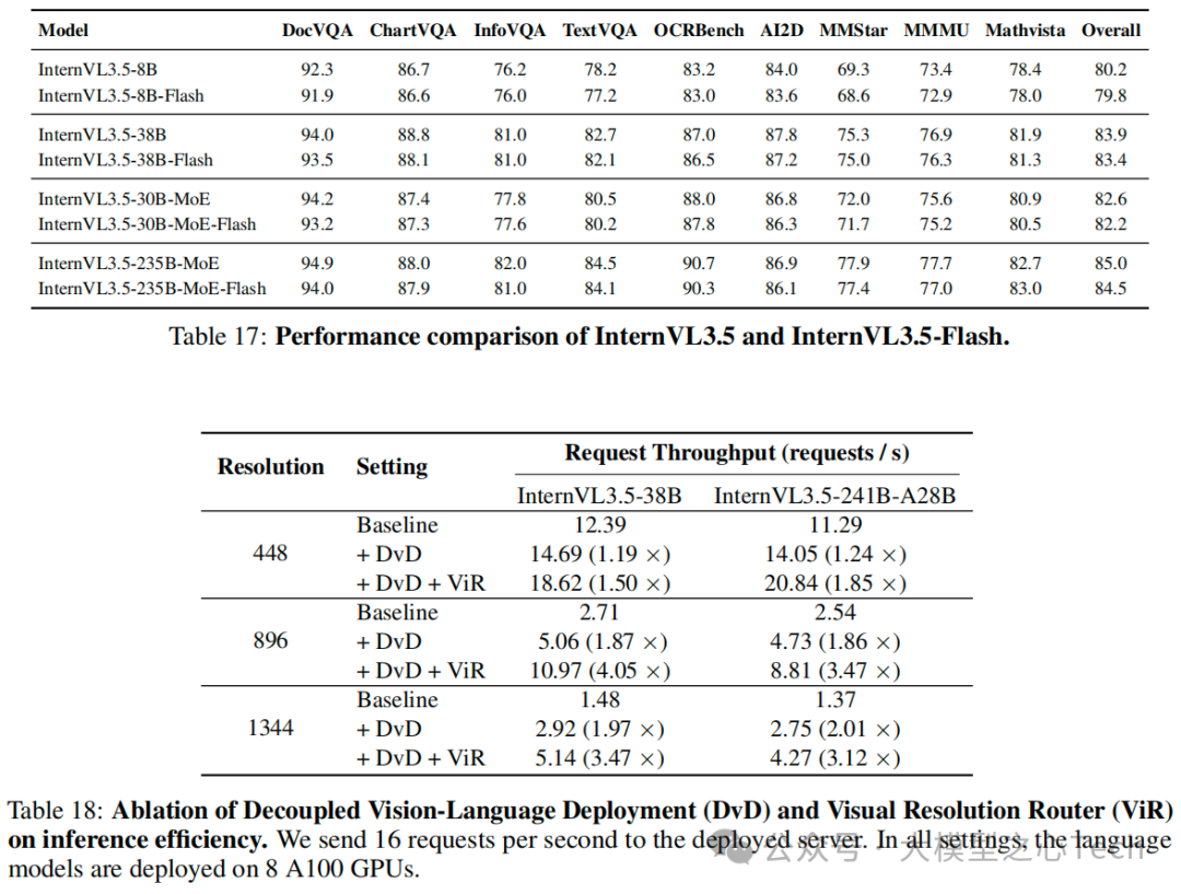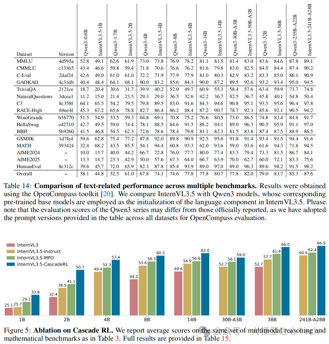 上海AI Lab又发力了!刚刚推出了开源多模态模型InternVL 3.5,在通用性、推理能力和推理效率方面显著推进了InternVL系列的发展!与前代产品相比,InternVL3.5系列通过我们提出的级联强化学习(Cascade RL)框架实现了更优的性能,该框架通过离线RL阶段实现稳定收敛,并通过在线RL阶段进行精细对齐。这种由粗到细的训练策略在下游推理任务(例如MMMU和MathVista)上带来了显著提升。为了优化效率,我们提出了一种视觉分辨率路由器(ViR),它能动态调整视觉标记的分辨率而不会损害性能。结合ViR,我们提出的解耦视觉-语言部署(DvD)方法将视觉和语言处理组织成一个异步的三阶段流水线,从而实现重叠执行并最大限度地减少流水线停顿。在一系列基准测试中,InternVL3.5在通用多模态能力、数学和多模态推理、文本理解、图形用户界面(GUI)代理、具身代理和真实世界理解任务上均取得了领先表现,显著缩小了与GPT-5等顶级商业模型的性能差距。我们相信,我们的开源模型和代码将推动多模态AI研究及其在现实世界中的应用。更多前沿大模型信息,欢迎加入大模型之心Tech知识星球~