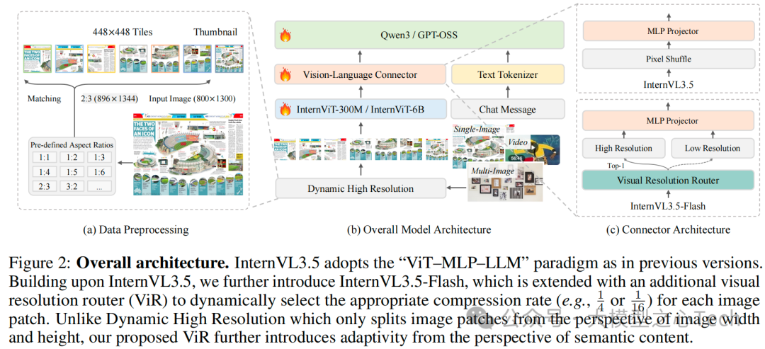 InternVL3.5 的整体架构如图 2 所示,主要由三个核心组件构成:动态高分辨率文本分词器、InternViT 视觉编码器,以及一个连接视觉与语言模态的连接器。该模型采用两阶段训练范式,包括大规模的预训练阶段和多阶段的后训练阶段。在预训练阶段,模型通过联合优化文本和多模态语料库来学习通用的视觉-语言表示。在后训练阶段,我们采用三阶段策略:监督微调(SFT)、级联强化学习(Cascade RL)和视觉一致性学习(ViCO),以进一步提升模型的指令遵循、推理和视觉理解能力。