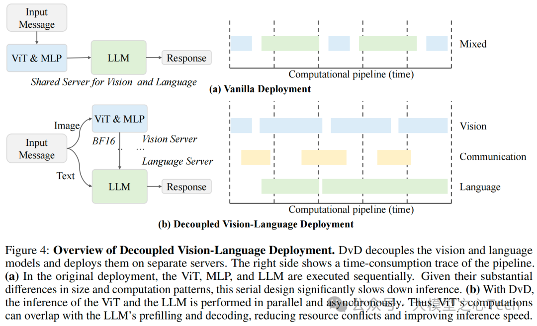 解耦的视觉-语言部署(Decoupled Vision-Language Deployment, DvD):在大规模在线部署多模态大语言模型(MLLMs)时,视觉和语言模型常常相互阻塞,导致额外的推理开销。为解决此问题,我们提出 DvD 框架。该框架通过将视觉编码和语言解码过程解耦,实现了视觉和语言模块的硬件成本优化,并促进了新模块的无缝集成,而无需修改语言服务器的部署。