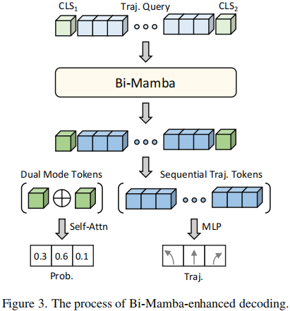 最后,为了充分利用意图推理器提供的特征,本文开发了一种分层的DETR类轨迹解码器。无锚点轨迹标记首先生成基于GRT派生特征的轨迹提议,然后作为最终轨迹解码的初始化锚点。鉴于轨迹状态的固有顺序性以及用于长期结构化动态建模的选择性状态空间模型(Mamba)的最新进展,本文结合了一种双向变体Bi-Mamba,以有效地捕获轨迹状态的顺序依赖关系。这种增强显著地提高了预测准确性和置信度(如表格6所示)。