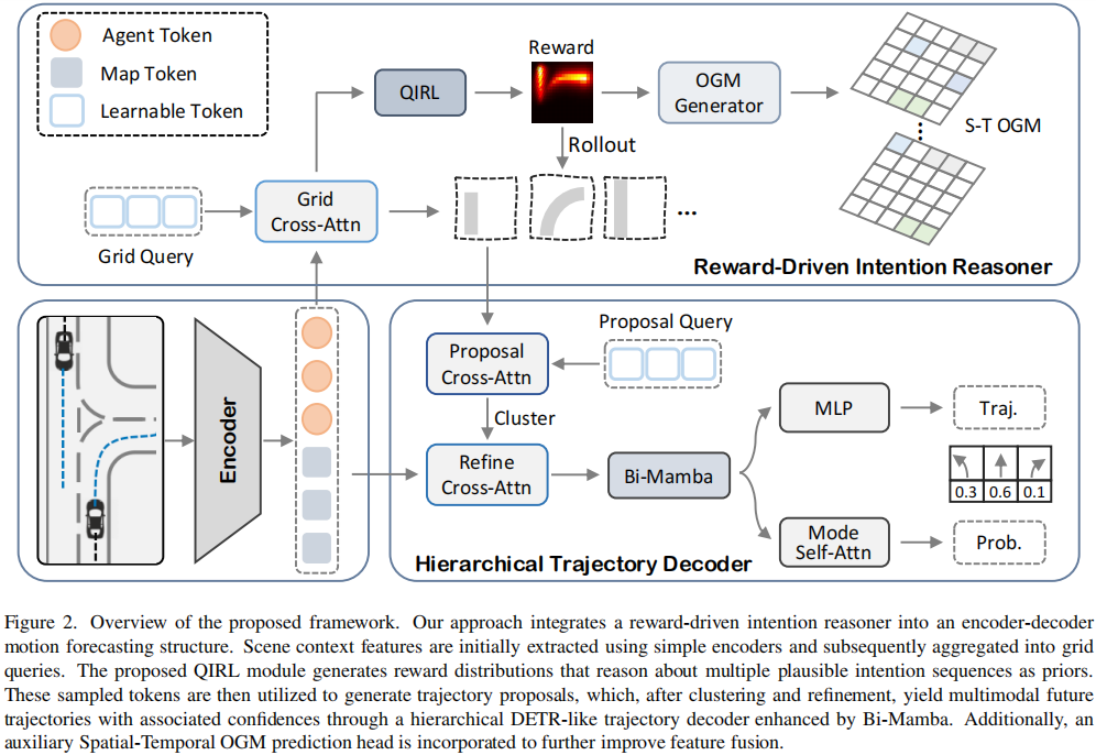 本项工作从规划的角度重新定义了轨迹预测任务的概念,并且提出了“先推理,后预测”的策略。本文提出了一种可解释的奖励驱动的意图推理器,它在QIRL框架内设计,通过以查询为中心的流程将MaxEnt IRL范式与矢量化上下文表示相结合,从而有效地为后续轨迹生成提供了信息丰富的意图先验。此外,本文还引入了一种与Bi-Mamba结构集成的分层DETR类轨迹解码器,它可以捕获轨迹的顺序依赖关系,并且显著地提高预测准确性和置信度。