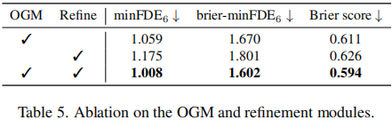 OGM和细化的影响:本文通过对每个模块进行消融研究,进一步评估了辅助的时空OGM模块和细化的影响,如表格5所示。