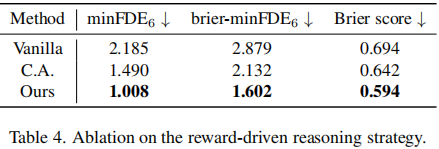 此外,通过将QIRL模块替换为用于特征提取的交叉注意力模块,以探索QIRL模块的具体影响。表格4中的结果表明,本文的QIRL模块在很大程度上优于这种替代方案,这表明QIRL可以有效地获取基本意图先验,并且提供有益于后续运动预测的信息引导。
