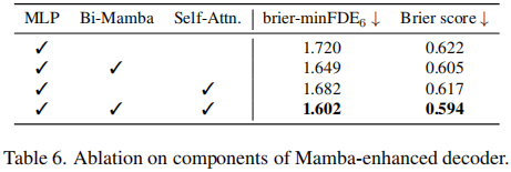 最后,为了充分利用意图推理器提供的特征,本文开发了一种分层的DETR类轨迹解码器。无锚点轨迹标记首先生成基于GRT派生特征的轨迹提议,然后作为最终轨迹解码的初始化锚点。鉴于轨迹状态的固有顺序性以及用于长期结构化动态建模的选择性状态空间模型(Mamba)的最新进展,本文结合了一种双向变体Bi-Mamba,以有效地捕获轨迹状态的顺序依赖关系。这种增强显著地提高了预测准确性和置信度(如表格6所示)。