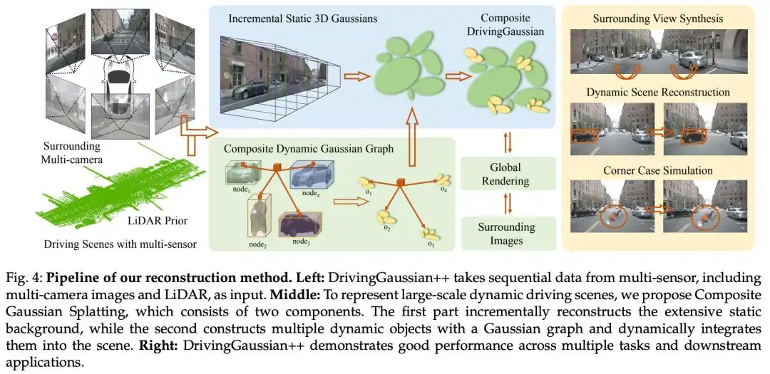 基于复合 GS 表示大规模动态驾驶场景,引入了两个新颖模块,包括增量静态3D高斯(Incremental Static 3D Gaussians)和复合动态高斯图(Composite Dynamic Gaussian Graphs)。前者增量地重建静态背景,而后者使用高斯图对多个动态目标进行建模。