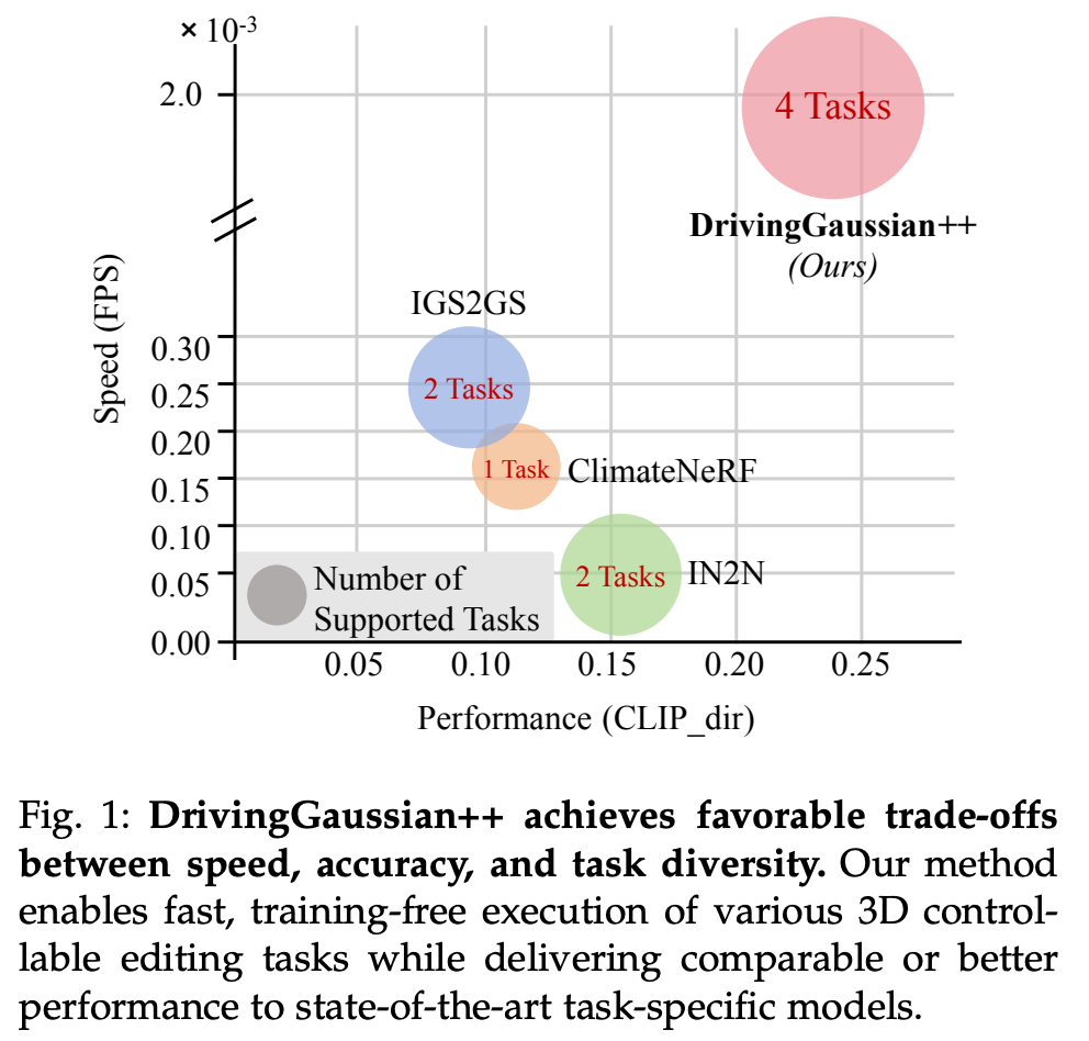 另一类方法不依赖扩散模型或额外图像,而是直接操纵3D粒子实现编辑。例如,ClimateNeRF 通过仿真粒子生成雨、雪、雾等天气效果,并将其嵌入神经场中以增强真实感。GaussianEditor 和 Infusion 等则基于 3DGS,通过语义属性识别编辑区域,或借助深度补全控制高斯修复,实现精确的3D插入与删除。这类方法通常编辑效率更高,多视角一致性也更好。DrivingGaussian++ 采用 3D 粒子级编辑,并将其进一步扩展到多个任务,包括纹理、目标和天气编辑。通过无需训练的范式,作者的方法为大规模自动驾驶场景实现了显式、可控和高效的编辑。