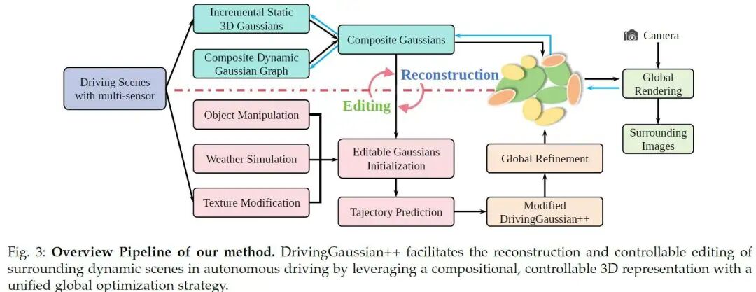 在本文中,作者提出 DrivingGaussian++(CVPR 2024 的工作 DrivingGaussian 的续作),核心思想是 利用来自多个传感器的序列数据对复杂的驾驶场景进行分层建模。作者采用复合 GS(Composite Gaussian Splatting)将场景分解为静态背景和动态目标,并分别重建每个部分。在此基础上,通过 GS 进行全局渲染捕捉真实世界中的遮挡,包括静态背景和动态目标。此外,作者将 LiDAR 先验融入高斯表示中,从而能够恢复更精确的几何结构并保持更好的多视图一致性。
