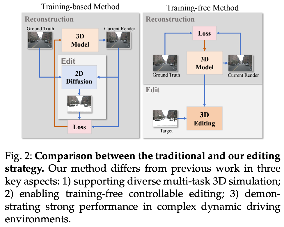 3D场景编辑任务 涵盖多种组成部分,包括风格迁移、运动修改、天气仿真以及目标的添加或移除。然而,这些编辑任务各有各的特点和难点,导致现有的编辑工具往往只能专攻某一项,缺少一个“全能型”的框架。目前常用的办法是先对2D画面进行编辑,效果好是好,但为了确保从各个角度看都一致,就得反复调整,非常耗时耗力。所以,这种方法很难用在大规模的自动驾驶仿真上。