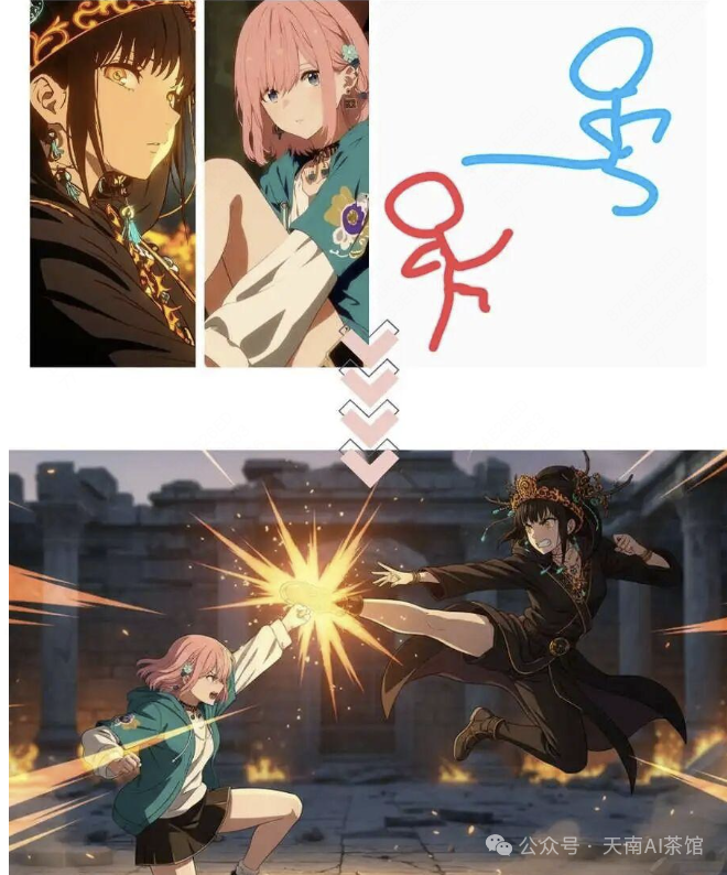 比如输入两个人像,以及一张手绘图,模型就能够理解你的意图生产生成下面的战斗动作。