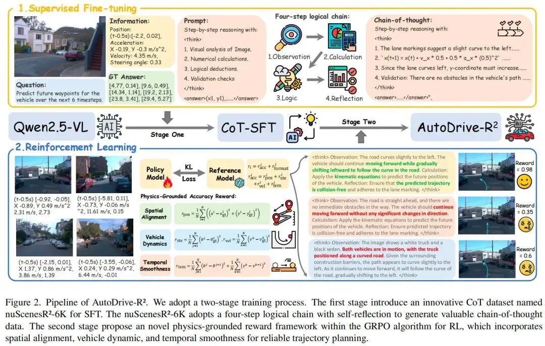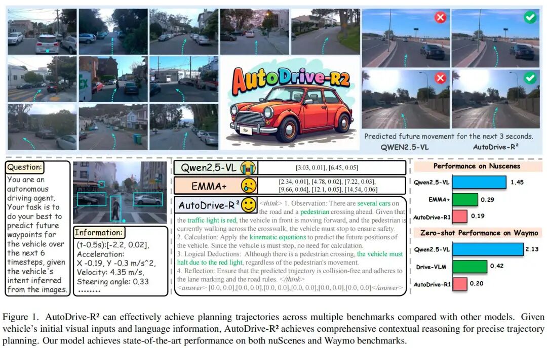 提出AutoDrive-R²——一种新型VLA框架,能够基于视觉信息与语言指令,实现带自反思步骤的语义推理与轨迹规划。