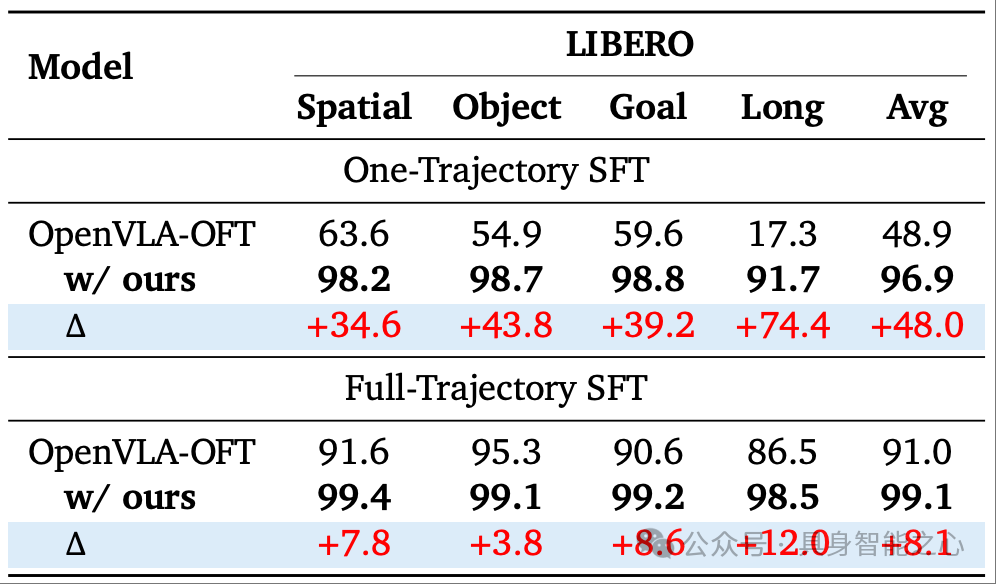 OpenVLA-OFT 的 LIBERO 平均成功率仅 48.9%,长时序任务 LIBERO-Long 仅 17.3%;