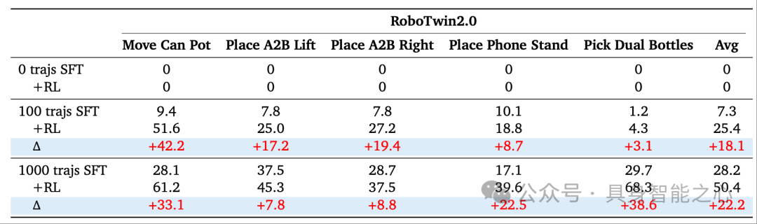 初始成功率为 0:即使施加 RL,性能仍维持 0%(如 “0 轨迹 SFT” 的所有任务),因无成功轨迹生成,奖励全为 0,无法更新梯度;