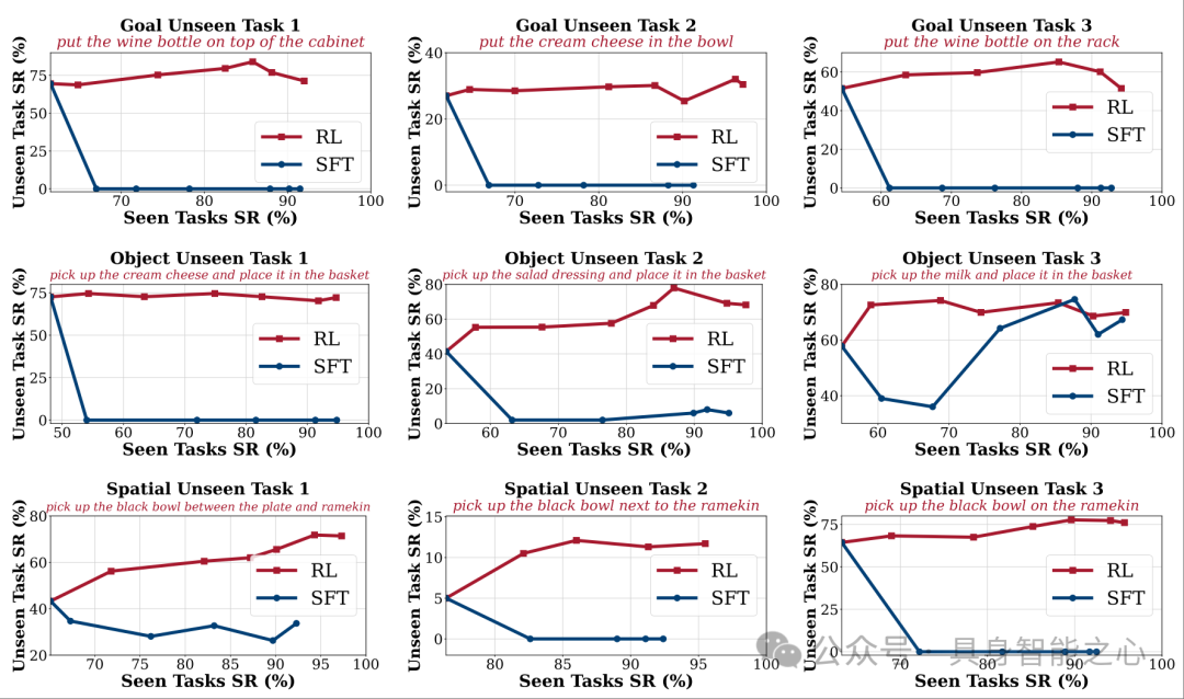 SFT:在已见任务成功率达 90% 以上时,未见任务出现 “灾难性遗忘”,部分任务成功率降至 0%(如 LIBERO-Goal 的 3 个未见任务);