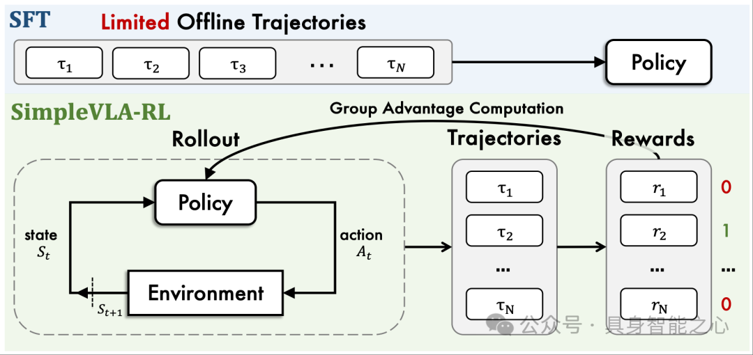 想让机器人灵活干活,视觉-语言-动作(VLA)模型是关键,但现在的训练方法太 “娇气” 了!靠监督微调(SFT)训练,不仅要海量人类操控轨迹数据(采集贵到离谱还难扩规模),遇到没见过的任务或环境,性能直接 “翻车”。
