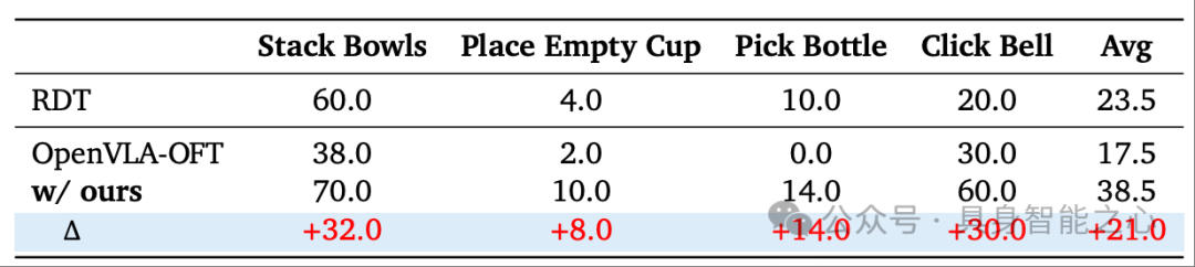 OpenVLA-OFT 的平均成功率仅 17.5%,“Pick Bottle” 任务完全失败;