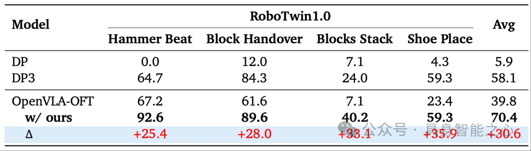 RoboTwin1.0(双臂操控基准):四个任务平均成功率从 39.8% 提升至 70.4%,其中 “Blocks Stack” 任务提升 33.1 个百分点(7.1%→40.2%)。