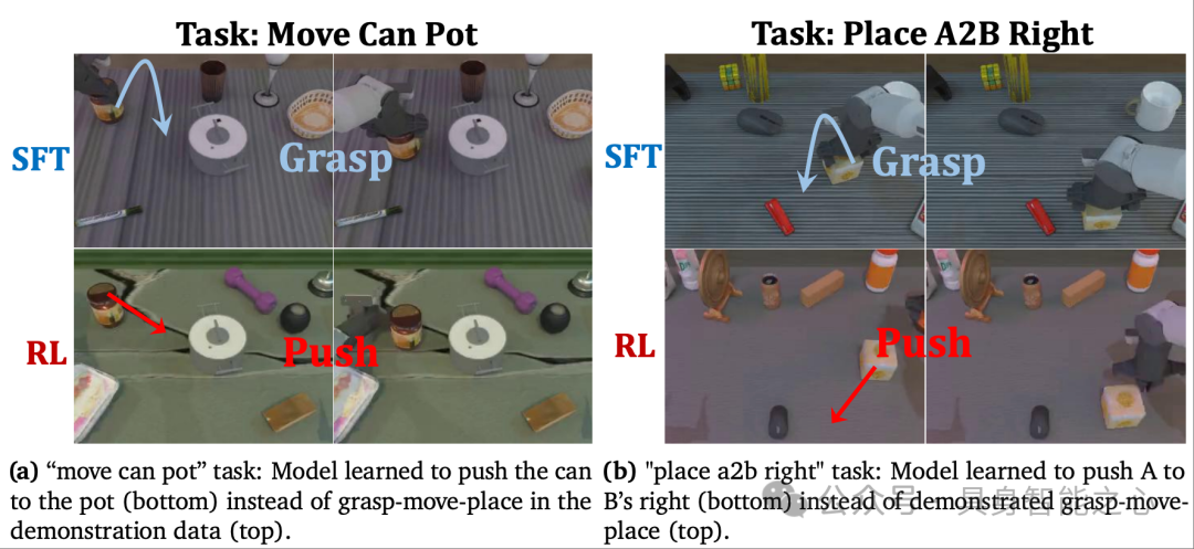 实现高效的 Sim-to-Real 迁移,提升真实世界任务性能。 同时,“Pushcut” 现象证明 RL 能让 VLA 模型超越人类演示的局限,探索更优策略,为未来自主、自适应机器人模型的研发提供了新范式。
