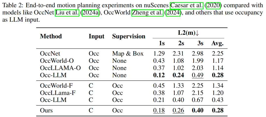 在表2中,诸如Occ-LLM等将占据信息作为大语言模型(LLM)输入的方法,因编码了强大的3D先验知识,在多个指标上均表现优异。这些方法以相机为输入,先通过占据预测网络获取占据信息,再将其输入至LLM。我们的方法则直接以相机为输入,并将占据预测过程集成到LLM中,最终实现当前最优结果。值得关注的是,OccVLA仅使用相机输入,却能与采用真值占据信息作为输入的方法达到相当的性能水平,这进一步凸显了将占据信息作为LLM输出的优势。此外,我们的模型仅为3B参数规模,却比7B参数的OccLLaMA表现更优,体现出更强的实际应用潜力。