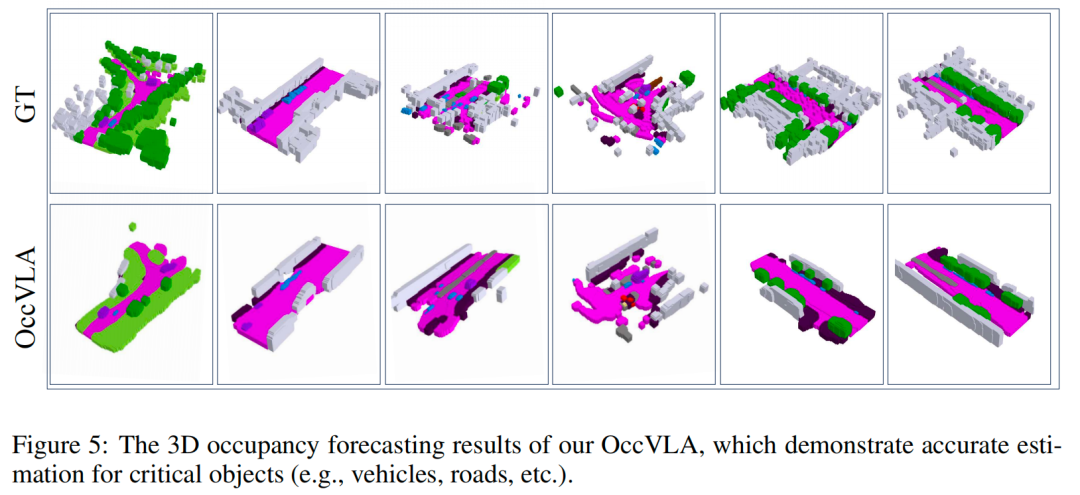该任务旨在利用相机捕获的多视角图像预测实时3D占据信息。尽管我们采用的是并非专为占据预测设计的LLM架构,但模型仍表现出极具竞争力的性能,超越了基线方法。具体而言,该模型仅处理当前时刻的输入,未利用过去状态的特征,直接输出当前时刻的3D占据信息,在mIoU指标上达到约10%。如图5所示,由于缺乏多时间戳图像输入,模型在处理遮挡区域(如树木后方的建筑物)时的能力受到限制,这一结果符合预期。尽管如此,模型在预测自动驾驶场景中的关键元素(如车道、车辆、行人以及车辆附近目标的细节信息)方面表现出色。