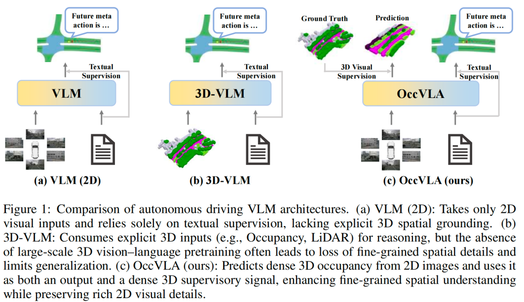 提出了自动驾驶框架OccVLA,该框架通过占用率预测过程扩展了VLM的3D推理能力,同时有效保留了2D图像中的视觉信息。