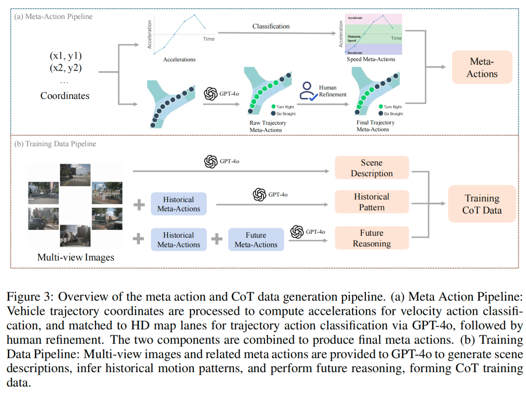 为确保标注质量,我们对nuScenes数据集上生成的所有元动作进行了人工检查,并对约20%的数据进一步优化,以提高标注一致性。由于鸟瞰图(BEV)视角可同时查看场景中所有轨迹坐标,因此所需的人工标注工作量极少。图3展示了我们的元动作及训练数据构建流程。