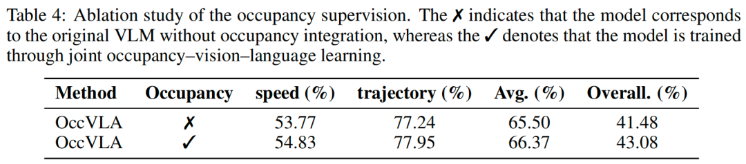 我们对比了占据预测过程对运动规划和视觉问答(VQA)两项任务性能的影响。如表4所示,若不引入占据监督(标记为“✗”),模型将仅依赖对2D图像的理解来规划未来动作;而融入占据监督(标记为“✓”)后,模型可获得额外的3D信息,从而突破稀疏文本监督的局限,并通过3D占据预测过程提升自身的3D理解能力。这一性能提升源于占据监督增强了LLM所学习视觉特征中的3D先验知识,最终使元动作预测性能提升约1.5%。