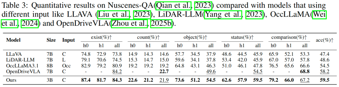 表3展示了在NuScenes-QA上的整体准确率。通过融入占据监督,我们的模型仅使用图像输入且参数规模为3B,却成功超越了那些依赖激光雷达3D输入或显式真值占据数据的更大规模模型。这一结果表明,在自动驾驶场景中,我们的方法能从纯视觉输入中更深入、更高效地学习3D理解能力。