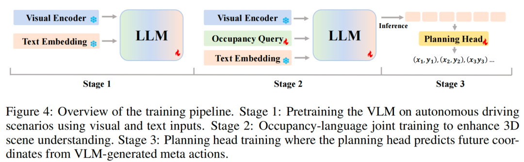 OccVLA——一个用于3D占用率预测和未来自车运动规划的统一框架。OccVLA的核心组件包括占用率预测模块和独立的规划头模块。此外,我们还引入了三阶段训练流程,以更好地平衡模型在不同任务上的性能。