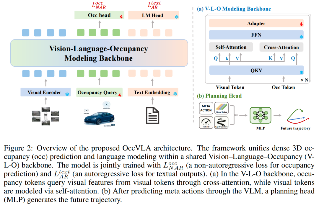 如图2(a)所示,右侧的占用率token可通过交叉注意力机制获取左侧视觉语言模型的视觉特征。实验表明,在文本推理过程中,模型收敛后,文本token是否能访问占用率特征,并不会对文本生成质量产生显著影响。这意味着仅通过视觉特征就能实现文本预测,因此在语言推理阶段,无需进行额外的占用率计算,从而提高了推理效率。