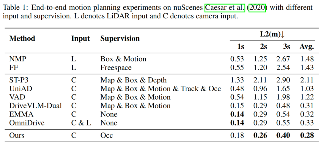如表1所示,我们将OccVLA的运动规划能力与多个性能强劲的基线模型进行对比,这些基线模型采用了不同的输入数据和监督方式。当前的最优方法EMMA依赖于监督标注(3D/BEV坐标及3D边界框),这限制了其在大规模数据集上的扩展性;而OmniDrive则依赖相机与激光雷达的联合输入。与之不同,OccVLA仅需相机输入,并以可大规模标注的占据信息作为监督。在平均L2距离指标上,我们的方法达到当前最优水平,同时在3秒内的轨迹规划任务中也取得了极具竞争力的结果。