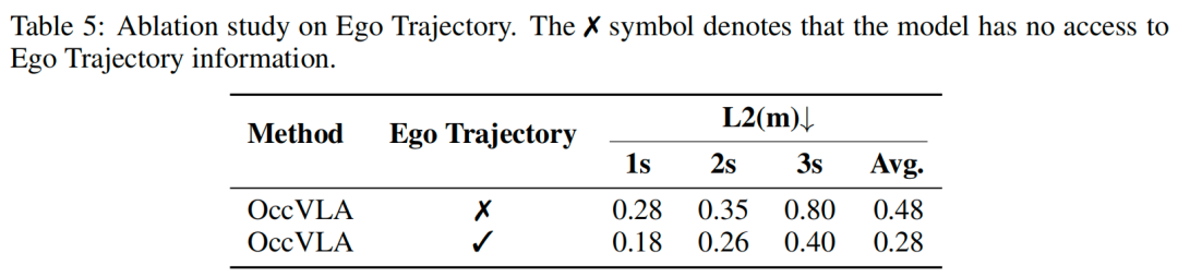 对于运动规划任务,以往研究指出,自车轨迹可能为模型引入过多先验知识,导致模型在数据集上过拟合。为确保对比的公平性,我们在表5中报告了不使用过去轨迹信息(标记为“✗”)时的规划性能。在相同条件下,我们的方法与当前最优方法(如VAD)相比,展现出具有竞争力的性能优势。值得注意的是,我们的模型不依赖高层导航指令,所有动作预测均完全基于模型对场景本身的理解,这凸显了OccVLA强大的性能和泛化能力,进一步证明其在不同场景中的有效性。