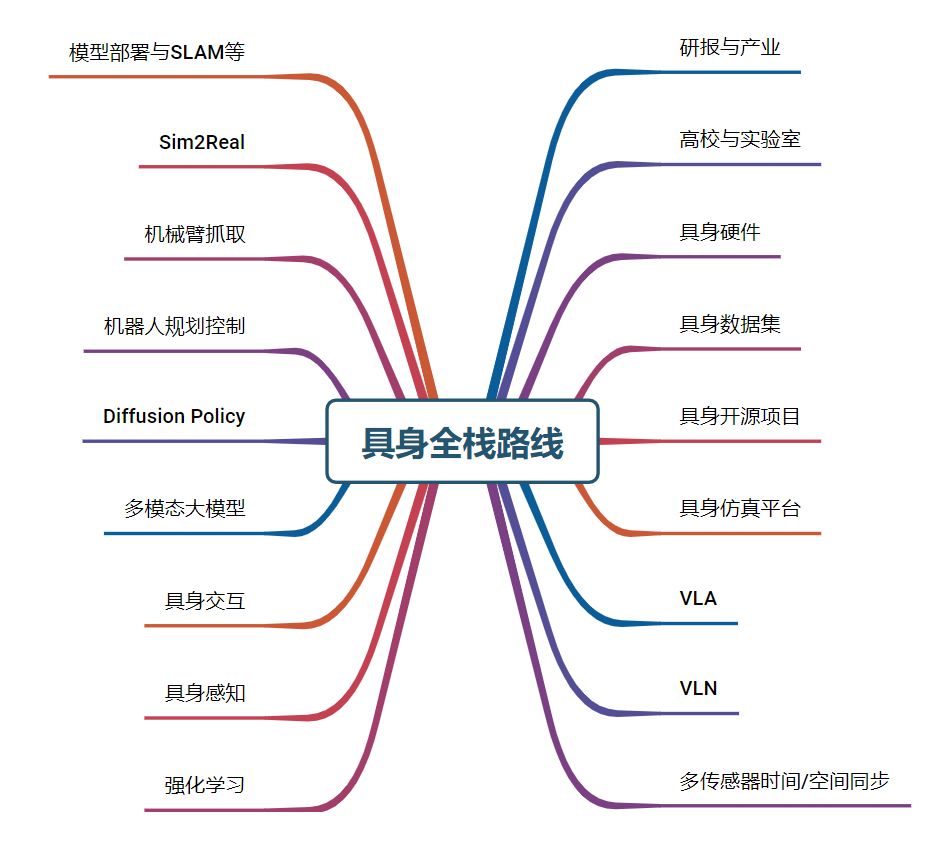 我们为大家汇总了近40+开源项目、近60+具身智能相关数据集、行业主流具身仿真平台、以及各类技术学习路线,包括但不限于: